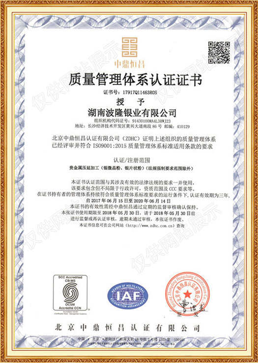 湖南波隆銀業有限公司是湖南波隆集團股份有限公司的全資子公司,成立于2016年4月15日,注冊資金1000萬。集白銀類產品的研發、銷售于一體,年營收1.22億元。2017年6月底,湖南波隆銀業有限公司順利通過了ISO9001質量體系管理認證,并獲得了相關文件證書,這標志著波隆銀業逐步邁入規范化、標準化的現代企業管理軌道。