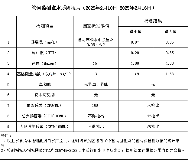 管網(wǎng)監(jiān)測(cè)點(diǎn)水質(zhì)周報(bào)表(2025年2月10日-2025年2月16日)