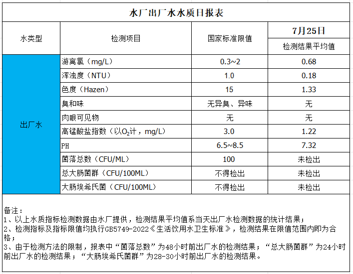 水廠出廠水水質(zhì)日?qǐng)?bào)表(2025-7-25)