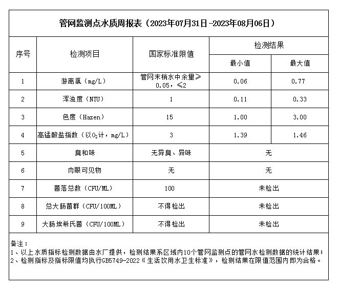 管網監測點水質周報表(2023年07月31日-2023年08月06日)