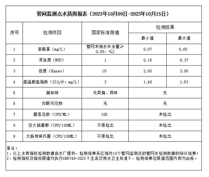 管網監測點水質周報表(2023年10月09日-2023年10月15日)