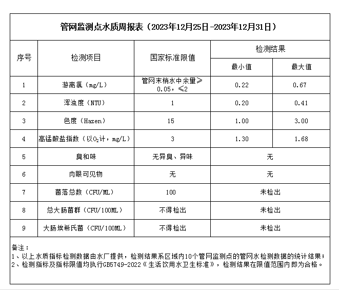 管網監測點水質周報表(2023年12月25日-2023年12月31日)