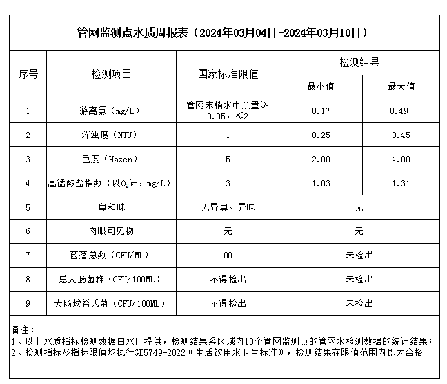 管網(wǎng)監(jiān)測點水質周報表(2024年03月04日-2024年03月10日)