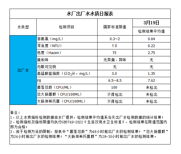 水廠出廠水水質日報表(2024-3-19)