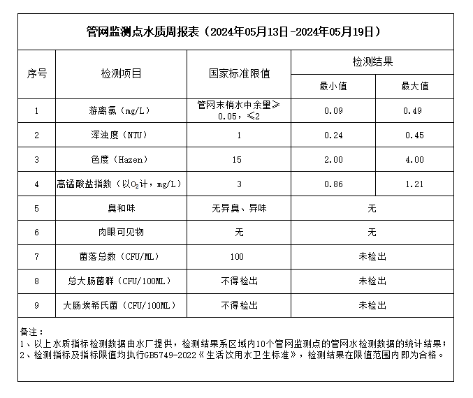 管網(wǎng)監(jiān)測點(diǎn)水質(zhì)周報(bào)表(2024年05月13日-2024年05月19日)