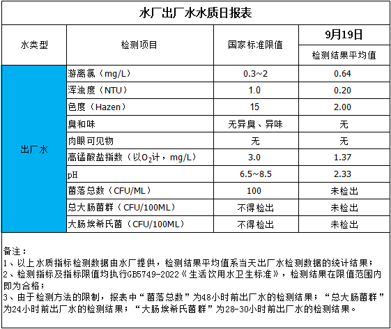水廠出廠水水質(zhì)日報表(2024-9-19)