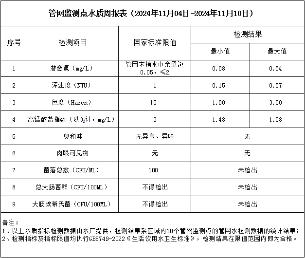 管網監(jiān)測點水質周報表(2024年11月4日-2024年11月10日)