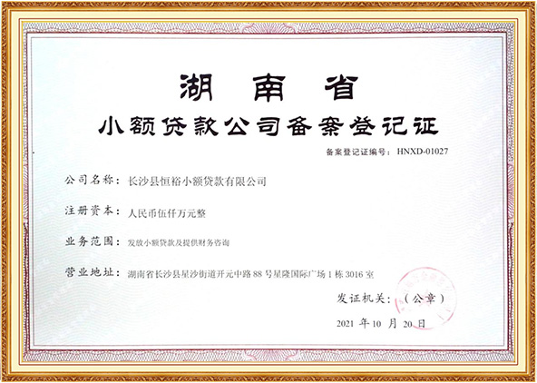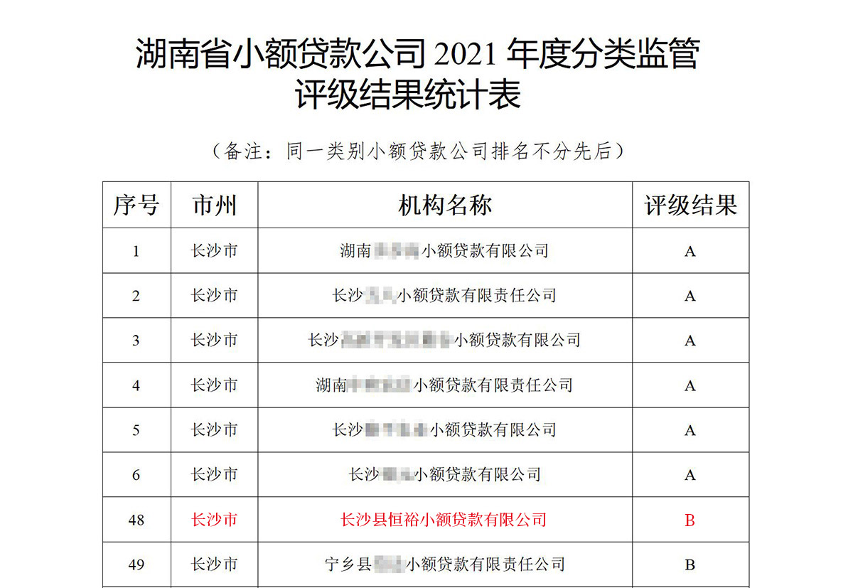 長沙縣恒裕小額貸款有限公司于2012年3月29日設立,經營范圍主要為家電批發零售流動貸款;國家政策允許的農村家電消費貸款;“三農”和中小企業需求的金融業務;為中小企業發展、管理、財務等咨詢業務及其他經批準的業務。多年來,一直被湖南省金融辦監管評級為B級資質單位。